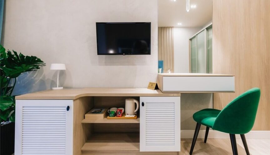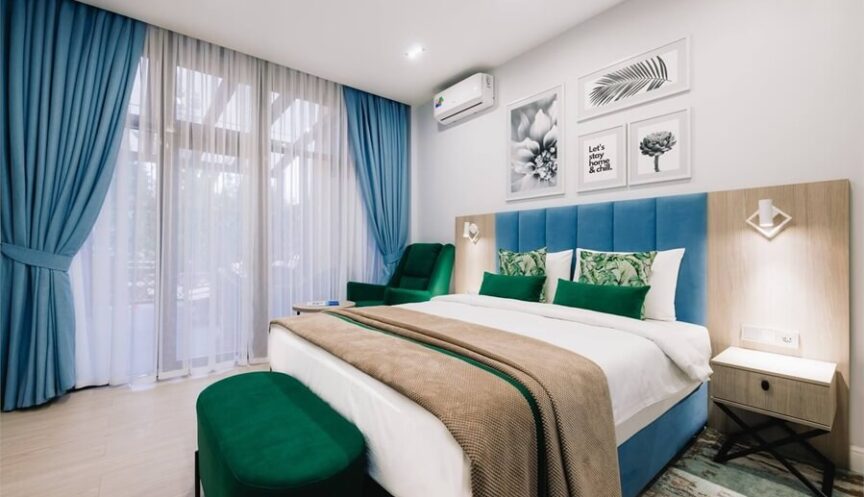Среди оборудования: кондиционер, мини-холодильник, сейф, ЖК-телевизор, телефон, чайный набор посуды и электрочайник.