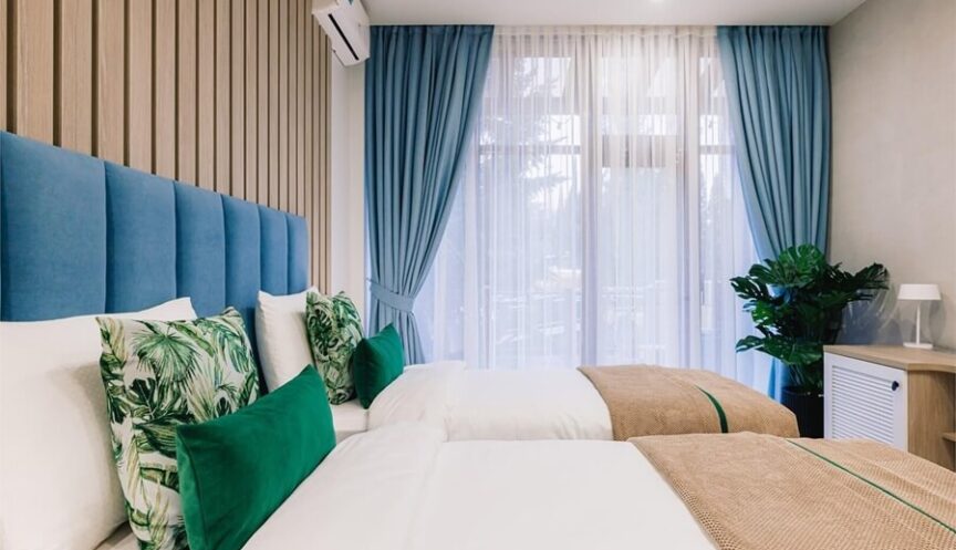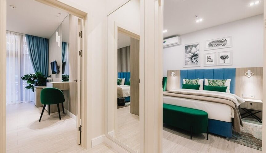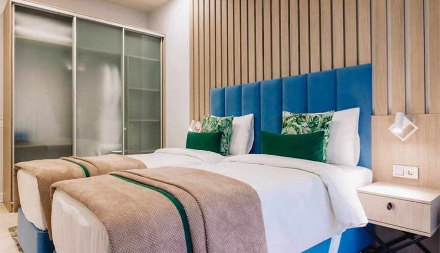 Двухкомнатный семейный номер в 6 корпусе площадью 32 квадратных метра расположен на первом этаже. Из номера можно выйти на террасу, откуда есть индивидуальный выход к комплексу открытых бассейнов и аквапарку. В номере есть вешалка, зеркало, две односпальные кровати, двуспальная кровать, прикроватные тумбочки, стол, стул и шкаф.
