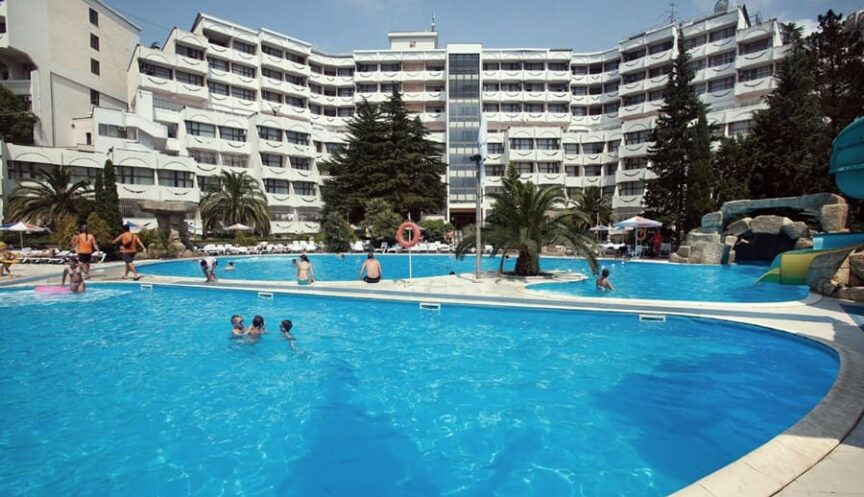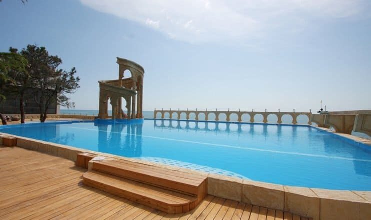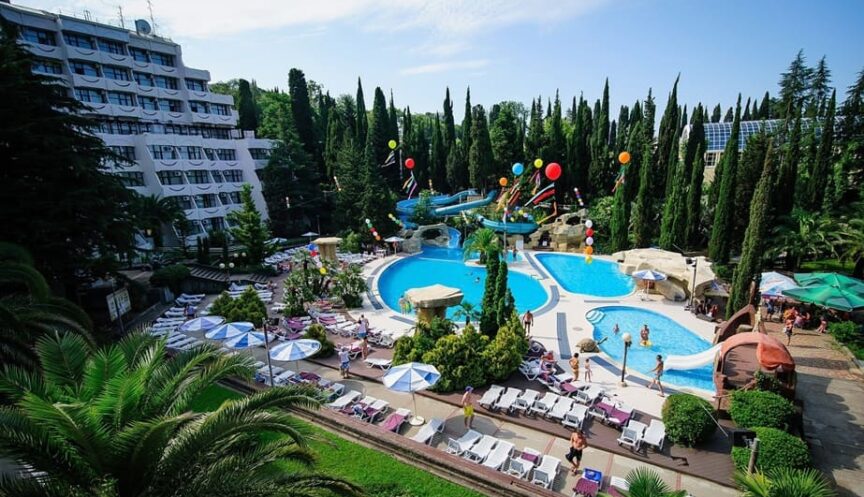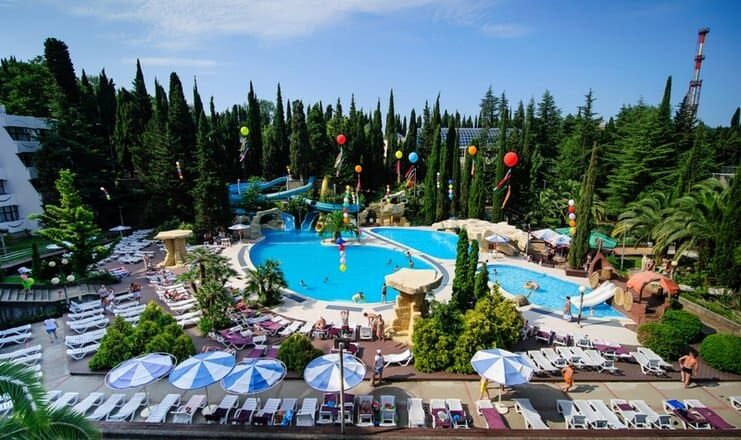 В парковой зоне санатория находится комплекс открытых бассейнов, где созданы все условия для семейного клубного отдыха. Здесь есть детский бассейн, островки с водопадом, горки для малышей, ди-джейская площадка, аква-бар с разнообразными коктейлями и напитками. Бассейн также оборудован шезлонгами, пляжными зонтами и душевыми кабинками.
